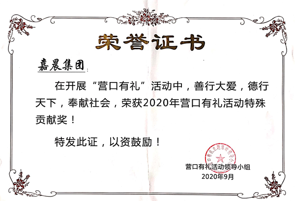 嘉晨集團(tuán)作為國(guó)家大型企業(yè)集團(tuán),在注重企業(yè)發(fā)展壯大的同時(shí),不忘回報(bào)社會(huì),反哺家鄉(xiāng),董事長(zhǎng)他始終不忘“家國(guó)人”的“思源”、堅(jiān)守“社會(huì)人”的“思報(bào)”,一直不負(fù)社會(huì)和國(guó)家的重托。多年來(lái),一直以踐行社會(huì)責(zé)任為己任,在汶川地震、玉樹(shù)地震等國(guó)家為難時(shí)刻,都曾第一時(shí)間做出響應(yīng),通過(guò)捐款捐物等方式義不容辭地履行社會(huì)責(zé)任。2019年,營(yíng)口市委為營(yíng)造全社會(huì)知禮、懂禮、守禮、行禮的良好氛圍,開(kāi)展“雷鋒文化 營(yíng)口有禮”的主題活動(dòng),嘉晨集團(tuán)捐款590萬(wàn)元;為打造“營(yíng)口名片”,冠名“營(yíng)口號(hào)”高鐵列車贊助600萬(wàn)元;今年的新冠肺炎疫情期間共計(jì)捐款530萬(wàn)元,支持當(dāng)?shù)卣蜈A這場(chǎng)抗“疫”攻堅(jiān)戰(zhàn)。在營(yíng)口援鄂醫(yī)療隊(duì)勝利返營(yíng)后,又向戰(zhàn)“疫"先鋒們捐款100萬(wàn),獎(jiǎng)勵(lì)她們的英雄壯舉!今天再次向“營(yíng)口有禮”基金捐贈(zèng)500萬(wàn)元,為營(yíng)口有禮活動(dòng)提供持續(xù)動(dòng)力!